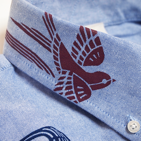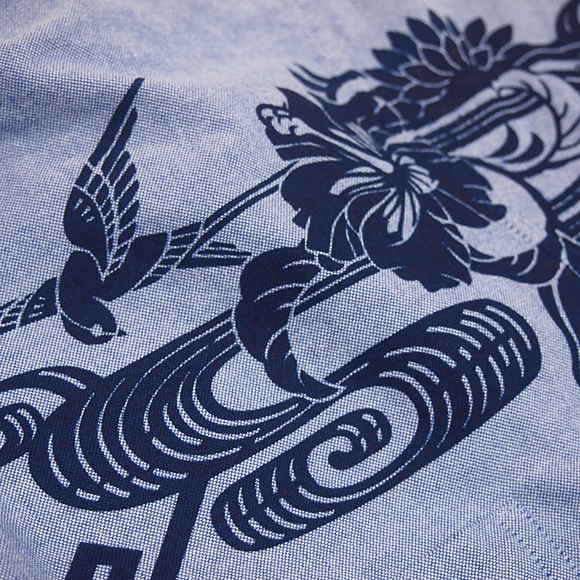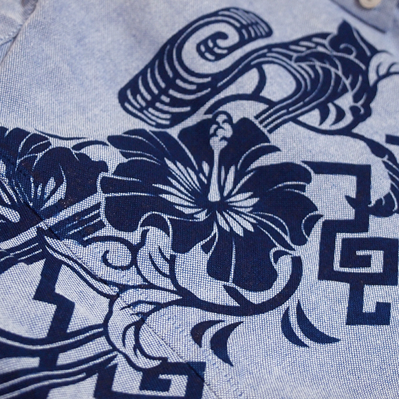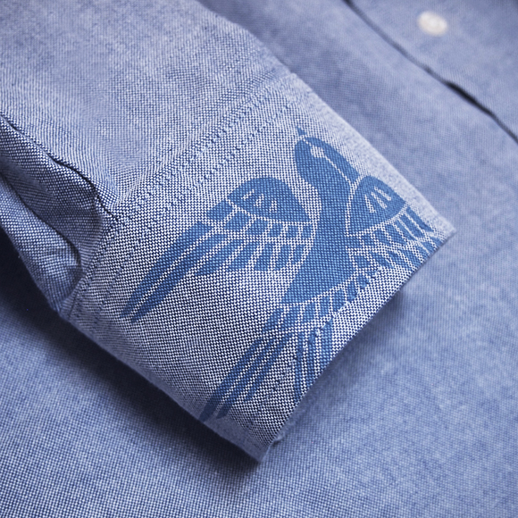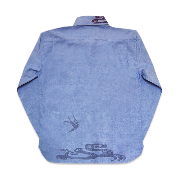 嵐をものともぜす力強く飛ぶ小鳥の姿を、紅型風にアレンジした南天らしいデザインです。 襟元と袖口に入った小鳥のデザインもポイントです。 この商品のサイズ展開は、M・L・XL です。 綿100%:オックスフォード